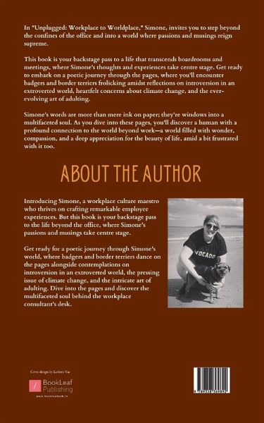 ""In """"Unplugged: Workplace to Worldplace,"""" Simone, invites you to step beyond the confines of the office and into a world where passions and musings reign supreme. This book is your backstage pass to a life that transcends boardrooms and meetings, where Simone's thoughts and experiences take centre stage. Get ready to embark on a poetic journey through the pages, where you'll encounter badgers and border terriers frolicking amidst reflections on introversion in an extroverted world, heartfelt concerns about climate change, and the ever-evolving art of adulting. Simone's words are more than mere ink on paper; they're windows into a multifaceted soul. As you dive into these pages, you'll discover a human with a profound connection to the world beyond work-a world filled with wonder, compassion, and a deep appreciation for the beauty of life, amid a bit frustrated with it too.""