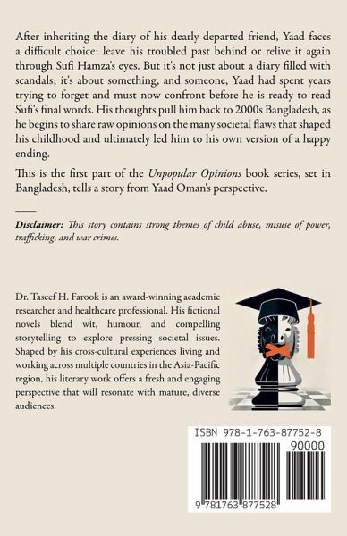 After inheriting the diary of his dearly departed friend, Yaad faces a difficult choice: leave his troubled past behind or relive it again through Sufi Hamza's eyes. But it's not just about a diary filled with scandals; it's about something, and someone, Yaad had spent years trying to forget and must now confront before he is ready to read Sufi's final words. His thoughts pull him back to 2000s Bangladesh, as he begins to share raw opinions on the many societal flaws that shaped his childhood and ultimately led him to his own version of a happy ending. This is the first part of the Unpopular Opinions book series, set in Bangladesh, tells a story from Yaad Oman's perspective. Disclaimer: This story contains strong themes of child abuse, misuse of power, trafficking, and war crimes. About the Author Dr. Taseef H. Farook is an award-winning academic researcher and healthcare professional with an extensive publication record in medicine and dentistry. His fictional novels blend wit, humour, and compelling storytelling to explore pressing societal issues. Shaped by his cross-cultural experiences living and working across multiple countries in the Asia-Pacific region, his literary work offers a fresh and engaging perspective that will resonate with mature, diverse audiences. Unpopular Opinions 2 Though their lives now seem worlds apart, Yaad and Sufi once shared a controversial passion for exposing societal flaws with brutally honest opinions. However, after Sufi's death, Yaad inherits his diary. Upon reading its pages, Yaad discovers a series of criminally unsavoury confessions from his morally ambiguous best friend. These confessions indirectly implicate Yaad as a silent witness to scandals that once ruined many lives.