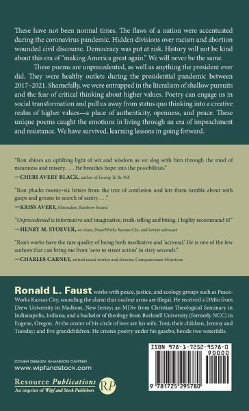 These have not been normal times. The flaws of a nation were accentuated during the coronavirus pandemic. Hidden divisions over racism and abortion wounded civil discourse. Democracy was put at risk. History will not be kind about this era of ""making America great again."" We will never be the same. These poems are unprecedented, as well as anything the president ever did. They were healthy outlets during the presidential pandemic between 2017-2021. Shamefully, we were entrapped in the literalism of shallow pursuits and the fear of critical thinking about higher values. Poetry can engage us in social transformation and pull us away from status quo thinking into a creative realm of higher values--a place of authenticity, openness, and peace. These unique poems caught the emotions in living through an era of impeachment and resistance. We have survived, learning lessons in going forward.