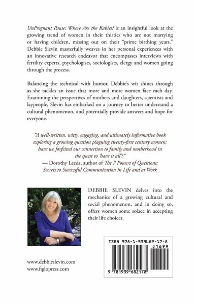 UnPregnant Pause: Where Are the Babies? is an insightful look at the growing trend of women in their thirties who are not marrying or having children, missing out on their "prime birthing years." Debbie Slevin masterfully weaves in her personal experiences with an innovative research endeavor that encompasses interviews with fertility experts, psychologists, sociologists, clergy and women going through the process. Balancing the technical with humor, Debbie’s wit shines through as she tackles an issue that more and more women face each day. Examining the perspectives of mothers and daughters, scientists and laypeople, Slevin has embarked on a journey to better understand a cultural phenomenon, and potentially provide answers and hope for everyone.
