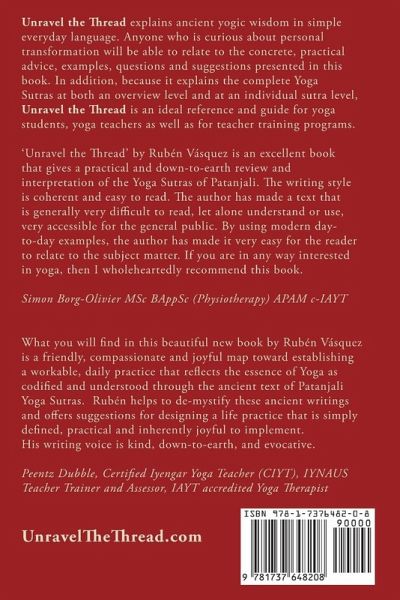Unravel the Thread explains ancient yogic wisdom in simple everyday language. The author has dedicated over fifteen years to studying, contemplating and practicing the Yoga Sutras to answer the question: How can I use the Yoga Sutra as a guide for my yoga practice and for my life? Anyone who is curious about personal transformation will be able to relate to the concrete, practical advice, examples, questions and suggestions presented in this book. Rubén Vásquez invites a broad audience to understand and practice the Yoga Sutras by:Summarizing the complete Yoga Sutras in one single word Explaining the key definition in the Yoga Sutras that guides all yoga practices Decoding the four aphorisms that encapsulate the message of the whole Yoga Sutras Introducing an effective method and exercises for applying the Yoga Sutras Interpreting each sutra in clear and simple terms with current examples Providing questions to guide reflection and application of each sutra Offering a final chapter with guidelines for practicing all aspects of yoga Listing of the complete Yoga Sutras in an easy to understand continuous translation Facilitating application by formulating all of the sutras as questions In addition, because it explains the complete Yoga Sutras at both an overview level and at an individual sutra level, Unravel the Thread is an ideal reference and guide for yoga students, yoga teachers as well as for teacher training programs.