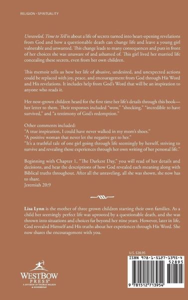 Unraveled, Time to Tell is about a life of secrets turned into heart-opening revelations from God and how a questionable death can change life and leave a young girl vulnerable and unwanted. This change leads to many consequences and puts in front of her choices she was unaware of and ashamed of. This girl lived her married life concealing these secrets, even from her own children. This memoir tells us how her life of abusive, undesired, and unexpected actions could be replaced with joy, peace, and encouragement from God through His Word and His revelations. It includes help from God's Word that will be an inspiration to anyone who reads it. Her now-grown children heard for the first time her life's details through this book-her letter to them. Their responses included "wow," "shocking," "incredible to have survived," and "a testimony of God's redemption." Other comments included: "A true inspiration, I could have never walked in my mom's shoes." "A positive woman that never let the negative get to her." "It's a truthful tale of one girl going through life seemingly by herself, striving to survive and revealing those experiences through her own writing of her personal life." Beginning with Chapter 1, "The Darkest Day," you will read of her details and decisions, and hear the descriptions of how God revealed each meaning along with Biblical truths throughout. After all the unraveling, all she was shown, she now has to share. Jeremiah 20:9