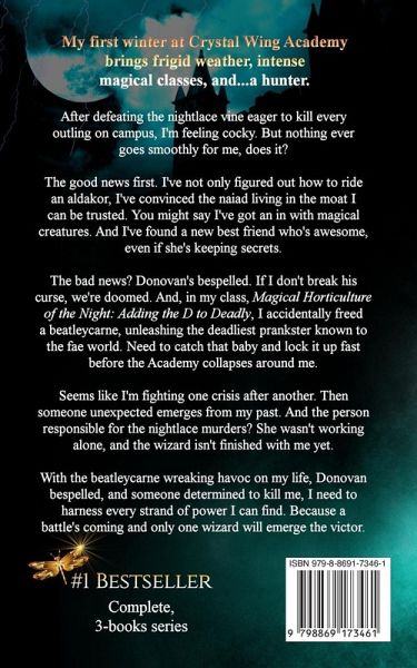 My first winter at Crystal Wing Academybrings frigid weather,intense magical classes,and...a hunter. After defeating the nightlace vine eager to kill every outling on campus, I'm feeling cocky. But nothing ever goes smoothly for me, does it? The good news first. I've not only figured out how to ride an aldakor, I've convinced the naiad living in the moat I can be trusted. You might say I've got an in with magical creatures. And I've found a new best friend who's awesome, even if she's keeping secrets. The bad news? Donovan's bespelled. If I don't break his curse, we're doomed. And, in my class, Magical Horticulture of the Night: Adding the D to Deadly, I accidentally freed a beatleycarne, unleashing the deadliest prankster known to the fae world. Need to catch that baby and lock it up fast before the Academy collapses around me. Seems like I'm fighting one crisis after another. Then someone unexpected emerges from my past. And the person responsible for the nightlace murders? She wasn't working alone, and the wizard isn't finished with me yet. With the beatleycarne wreaking havoc on my life, Donovan bespelled, and someone determined to kill me, I need to harness every strand of power I can find. Because a battle's coming and only one wizard will emerge the victor.