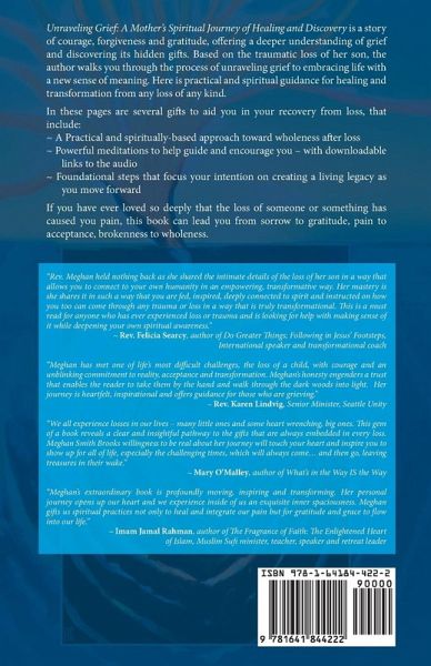 If you have ever loved so deeply that the loss of someone or something has caused you pain, this book can lead you from sorrow to gratitude, pain to acceptance, brokenness to wholeness. Unraveling Grief offers everyone the realization we can embrace life in new and empowering ways, using what grief offers us to transform how we live that not only makes a difference in the world around us, but in honoring the legacy of who or what we grieve. Have you ever been gripped by grief from the pain of loss? Or maybe you're are in the midst of the intensity of grieving now and wonder, how will I ever find a way to live again? How do I heal my broken heart? How do I move forward when my world is shattered? Author Meghan Smith Brooks says, "...as grief has taken up residence in who we are....I decided my only option is to make friends with grief since we hang out so much together. I realize it is a lifetime relationship whether I like it or not." There is no "getting over grief" as our culture seems to want to push us into believing, so we can get back to "normal". Meghan inspires us to realize instead, we must gently "move through it", allowing the energy to transform us as we learn to integrate grief into our "new" self, a better self, with a deeper more empowered capacity for living. Unraveling Grief: A Mother's Spiritual Journey of Healing and Discovery is a story of courage, forgiveness and gratitude, offering a deeper understanding of grief and the gifts hidden within it. Based on her own traumatic experience after the murder of her 29 year old son, Meghan walks you through the process of unraveling grief to embracing life with a new sense of meaning - using both her personal grief journey, and her spiritual education as a minister and grief coach. She writes from her own raw emotional pain, the loss that takes one to the depths of despair, and the very real process of finding our way back into our bodies and living again - as grief is a life altering experience no matter what the cause. Offering what she learned about the power of feeling to allow for healing, acceptance as a way forward, and the discovery of what grief has to offer us as something to enhance who we are, not diminish the life we have. Here is practical and spiritual guidance for healing and transformation from any loss of any kind. In these pages you will find multiple gifts to aid you in your recovery from loss, that include: ~ A Practical and spiritually-based approach toward wholeness after loss ~ Powerful meditations to help guide and encourage you - with downloadable links to the audio ~ Foundational steps that focus your intention on creating a living legacy as your new vision for life, based on finding the hidden gift within grief. Website for more information for on-site and virtual events, retreats and courses offered, or to contact Meghan as a speaker virtually or live: www.unityawakeningways.org..<