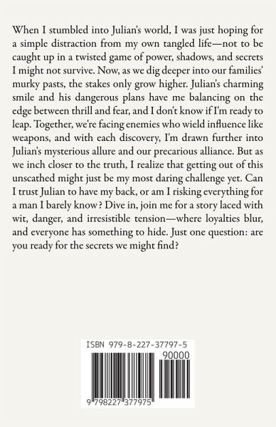 When I stumbled into Julian's world, I was just hoping for a simple distraction from my own tangled life-not to be caught up in a twisted game of power, shadows, and secrets I might not survive. Now, as we dig deeper into our families' murky pasts, the stakes only grow higher. Julian's charming smile and his dangerous plans have me balancing on the edge between thrill and fear, and I don't know if I'm ready to leap. Together, we're facing enemies who wield influence like weapons, and with each discovery, I'm drawn further into Julian's mysterious allure and our precarious alliance. But as we inch closer to the truth, I realize that getting out of this unscathed might just be my most daring challenge yet. Can I trust Julian to have my back, or am I risking everything for a man I barely know? Dive in, join me for a story laced with wit, danger, and irresistible tension-where loyalties blur, and everyone has something to hide. Just one question: are you ready for the secrets we might find?
