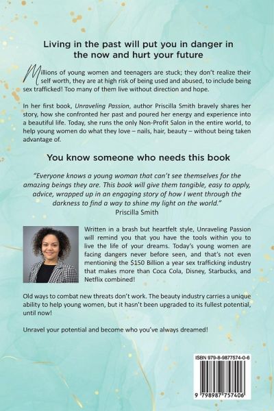 Living in the past will put you in danger in the now and hurt your future. Millions of young women and teenagers are stuck; they don't realize their self-worth, and they are at high risk of being used and abused, including being sex trafficked! Too many of them live without direction and hope. In her first book, Unraveling Passion, author Priscilla Smith bravely shares her story of how she confronted her past and poured her energy and experience into a beautiful life. Today, she runs the only nonprofit salon in the entire world to help young women do what they love-nails, hair, and beauty-without being taken advantage of. You know someone who needs this book! "Everyone knows a young woman that can't see themselves for the amazing beings they are. This book will give them tangible, easy-to-apply, advice, wrapped up in an engaging story of how I went through the darkness to find a way to shine my light on the world." ~ Priscilla Smith Written in a brash but heartfelt style, Unraveling Passion will remind you that you have the tools within you to live the life of your dreams. Today's young women are facing dangers never before seen, and that's not even mentioning the $150 billion-a-year sex trafficking industry that makes more than Coca-Cola, Disney, Starbucks, and Netflix combined! Old ways to combat new threats don't work. The beauty industry carries a unique ability to help young women, but it hasn't been upgraded to its fullest potential, until now! Unravel your potential and become who you've always dreamed of being!