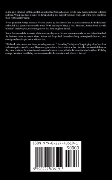 In the quiet village of Verdon, nestled amidst rolling hills and ancient forests, lies a mansion steeped in legend and lore. Whispered tales speak of its dark past, of spirits trapped within its walls, and of the curse that binds them to this earthly realm. When journalist Aditya arrives in Verdon, drawn by the allure of the mansion's mysteries, he finds himself embroiled in a quest to uncover the truth. With the help of Maya, a local historian, Aditya delves into the mansion's shadowy past, uncovering secrets that have long been buried. But as they unravel the mysteries of the mansion, they soon discover that some truths are best left undisturbed. As darkness closes in around them, Aditya and Maya find themselves facing unimaginable horrors, their courage and resolve put to the ultimate test. Filled with twists, turns, and heart-pounding suspense, "Unraveling The Mystery" is a gripping tale of love, loss, and redemption. As Aditya and Maya race against time to break the curse that binds the mansion's inhabitants, they must confront their own inner demons and come to terms with the darkness that dwells within. Will they emerge victorious, or will they become ensnared in the mansion's web of secrets forever?