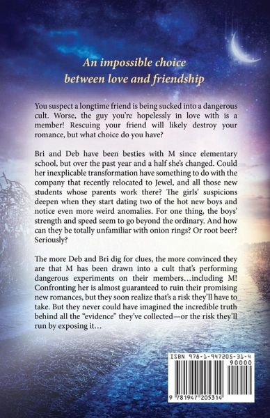 An impossible choice between love and friendship You suspect a longtime friend is being sucked into a dangerous cult. Worse, the guy you're hopelessly in love with is a member! Rescuing your friend will likely destroy your romance, but what choice do you have? Bri and Deb have been besties with M since elementary school, but over the past year and a half she's changed. Could her inexplicable transformation have something to do with the company that recently relocated to Jewel, and all those new students whose parents work there? The girls' suspicions deepen when they start dating two of the hot new boys and notice even more weird anomalies. For one thing, the boys' strength and speed seem to go beyond the ordinary. And how can they be totally unfamiliar with onion rings? Or root beer? Seriously? The more Deb and Bri dig for clues, the more convinced they are that M has been drawn into a cult that's performing dangerous experiments on their members...including M! Confronting her is almost guaranteed to ruin their promising new romances, but they soon realize that's a risk they'll have to take. But they never could have imagined the incredible truth behind all the "evidence" they've collected-or the risk they'll run by exposing it...