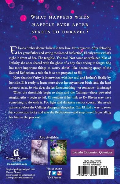 What happens when happily ever after starts to unravel? Eliyana Ember doesn't believe in true love. Not anymore. After defeating her grandfather and saving the Second Reflection, El only trusts what's right in front of her. The tangible. The real. Not some unexplained Kiss of Infinity she once shared with the ghost of a boy she's trying to forget. She has more important things to worry about--like becoming queen of the Second Reflection, a role she is so not prepared to fill. Now that the Verity is intertwined with her soul and Joshua's finally by her side, El is ready to learn more about her mysterious birth land, the land she now rules. So why does she feel like something--or someone--is missing? When the thresholds begin to drain and the Callings, those powerful magical gifts, begin to fail, El wonders if her link to Ky Rhyen may have something to do with it. For light and darkness cannot coexist. She needs answers before the Callings disappear altogether. Can El find a way to sever her connection to Ky and save the Reflections--and keep herself from falling for him in the process? "A sequel that outshines its already brilliant predecessor." --Nadine Brandes, award-winning author of Romanov and Fawkes 1. The second in the low-spice, YA romantasy trilogy 2. Books best read in order: * Book 1: Unblemished * Book 2: Unraveling * Book 3: Unbreakable 3. Full-length book 4. Includes discussion questions for book clubs