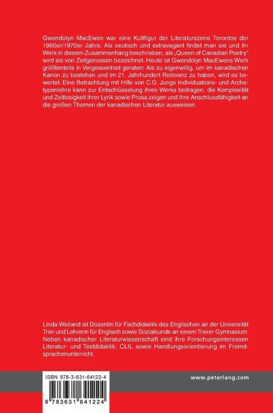 Gwendolyn MacEwen war eine Kultfigur der Literaturszene Torontos der 1960er/1970er Jahre. Als exotisch und extravagant findet man sie und ihr Werk in diesem Zusammenhang beschrieben, als "Queen of Canadian Poetry" wird sie von Zeitgenossen bezeichnet. Heute ist Gwendolyn MacEwens Werk größtenteils in Vergessenheit geraten: Als zu eigenwillig, um im kanadischen Kanon zu bestehen und im 21. Jahrhundert Relevanz zu haben, wird es bewertet. Eine Betrachtung mit Hilfe von C.G. Jungs Individuations- und Archetypenlehre kann zur Entschlüsselung ihres Werks beitragen, die Komplexität und Zeitlosigkeit ihrer Lyrik sowie Prosa zeigen und ihre Anschlussfähigkeit an die großen Themen der kanadischen Literatur ausweisen.