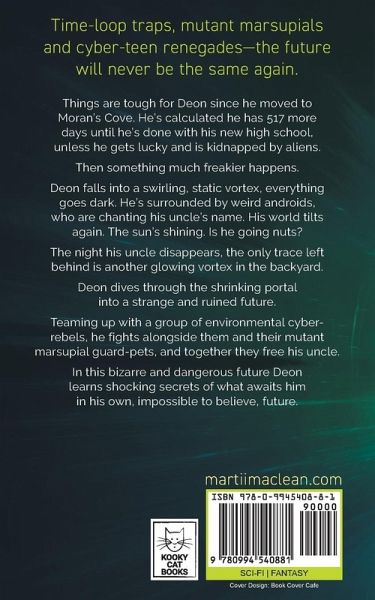 Time-loop traps, mutant marsupials and cyber-teen renegades-the future will never be the same again. Things are tough for Deon since he moved from the city to Moran's Cove. He doesn't surf and he hasn't figured out how to fit in. Deon's calculated he has 517 more days until he graduates and is done with the bullies at his new high school. Or maybe he'll get lucky and be kidnapped by aliens. One afternoon while Deon's out for a run after school, something much freakier happens. He's dragged into a swirling, static vortex. The air crackles around him, he's to the ground and everything's in darkness. He's surrounded by weird androids, who are chanting his uncle's name. His world tilts again, pulling him back through the static storm and the sun's shining. Is he going nuts? Then his uncle disappears and the only clue about what might have happened is another glowing crackling vortex, this time in the backyard behind Uncle Nifty's deserted house. Deon dives through the shrinking portal. He's surrounded by the crushing static. It feels like he falls forever. When he finally hits the ground, he has been transported into a strange and ruined future. Everything is gone, his uncle's house, the town, everything around him is devastated and flooded. He hears a cry in the distance and searches frantically for is uncle. All he finds is a broken pencil, he uncle's pencil, pointing in the direction of the far off voices. Running through the swampy remains of Moran's Cove, Deon tries to make sense of what could have happened. Could he somehow be in the future? Maybe he is going nuts? He finds more markers and runs on, searching, into the dense rainforest surrounding his ruined town. Suddenly he is cornered by tree-climbing mutant marsupial creatures that growl, creeping closer, until Deon is trapped between a rock ledge and their gnashing teeth. There seems to be no escape from the frightening weirdness and then the humans drop out of the trees wearing shining exoskeletons, some fly down on massive powered wings and the weirdness ramps up. Lucky for Deon, these are the good guys and he is invited to team up with this group of environmental cyber-rebels. He fights alongside them and their mutant marsupial guard-pets to help free some of the missing team members and then, together they search to recover Deon's uncle. In this bizarre and dangerous future Deon sees the fate of Earth, the environmental destruction that changed his world forever. He meets a strange new thinking machine that is working to repair the world and he discovers shocking secrets about his own fate and what awaits him when he returns to his own time to face in his own, impossible to believe, future.