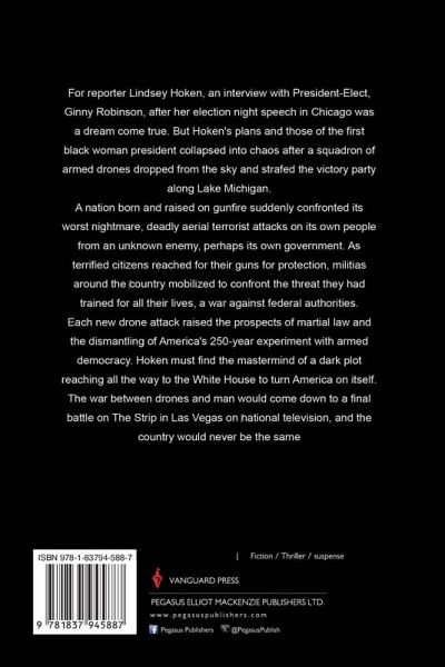 For reporter Lindsey Hoken, an interview with President-Elect, Ginny Robinson, after her ¿election night speech in Chicago was a dream come true. But Hoken's plans and those of ¿the first black woman president collapsed into chaos after a squadron of armed drones ¿dropped from the sky and strafed the victory party along Lake Michigan.¿ ¿ A nation born and raised on gunfire suddenly confronted its worst nightmare, deadly ¿aerial terrorist attacks on its own people from an unknown enemy, perhaps its own ¿government. As terrified citizens reached for their guns for protection, militias around the ¿country mobilized to confront the threat they had trained for all their lives, a war against ¿federal authorities.¿ ¿ Each new drone attack raised the prospects of martial law and the dismantling of ¿America's 250-year experiment with armed democracy. Hoken must find the mastermind ¿of a dark plot reaching all the way to the White House to turn America on itself. The war ¿between drones and man would come down to a final battle on The Strip in Las Vegas on ¿national television, and the country would never be the same.