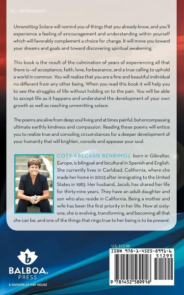 Unremitting Solace will remind you of things that you already know, and you'll experience a feeling of encouragement and understanding within yourself which will favorably complement a choice for change. It will move you toward your dreams and goals and toward discovering spiritual awakening. This book is the result of the culmination of years of experiencing all that there is-of acceptance, faith, love, forbearance, and a true calling to uphold a world in common. You will realize that you are a fine and beautiful individual no different from any other being. When you read this book it will help you to see the struggles of life without holding on to the pain. You will be able to accept life as it happens and understand the development of your own growth as well as reaching unremitting solace. The poems are alive from deep soul living and at times painful, but encompassing ultimate earthly kindness and compassion. Reading these poems will entice you to realize true and consoling circumstances for a deeper development of your humanity that will brighten, console and appease your soul.