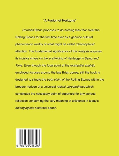 _A Fusion of Horizons_Unrolled Stone proposes to do nothing less than treat the Rolling Stones for the first time ever as a genuine cultural phenomenon worthy of what might be called 'philosophical' attention. The fundamental significance of this analysis acquires its incisive shape on the scaffolding of Heidegger's Being and Time. Even though the focal point of the existential analytic employed focuses around the late Brian Jones, still the book is designed to situate the truth-claim of the Rolling Stones within the broader horizon of a universal radical uprootedness which constitutes the necessary point of departure for any serious reflection concerning the very meaning of existence in today's belongingless historical epoch.