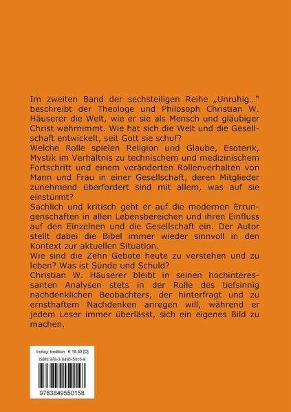 Im zweiten Band der sechsteiligen Reihe Unruhig beschreibt der Theologe und Philosoph Christian W. Häuserer die Welt, wie er sie als Mensch und gläubiger Christ wahrnimmt. Wie hat sich die Welt und die Gesellschaft entwickelt, seit Gott sie schuf?