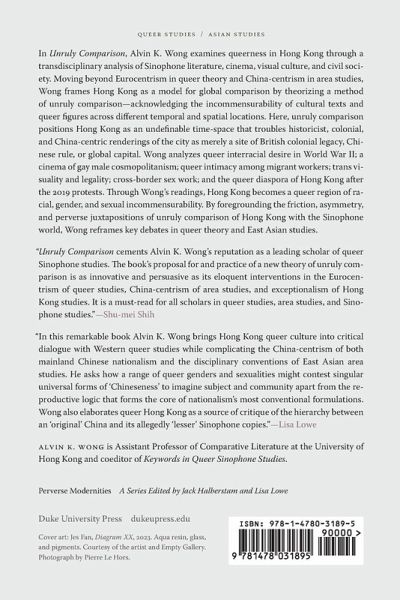 In Unruly Comparison, Alvin K. Wong examines queerness in Hong Kong through a transdisciplinary analysis of Sinophone literature, cinema, visual culture, and civil society. Moving beyond Eurocentrism in queer theory and China-centrism in area studies, Wong frames Hong Kong as a model for global comparison by theorizing a method of unruly comparison-acknowledging the incommensurability of cultural texts and queer figures across different temporal and spatial locations. Here, unruly comparison positions Hong Kong as an undefinable time-space that troubles historicist, colonial, and China-centric renderings of the city as merely a site of British colonial legacy, Chinese rule, or global capital. Wong analyzes queer interracial desire in WWII; a cinema of gay male cosmopolitanism; queer intimacy among migrant workers; trans visuality and legality; cross-border sex work; and the queer diaspora of Hong Kong after the 2019 protests. Through Wong’s readings, Hong Kong becomes a queer region of racial, gender, and sexual incommensurability. By foregrounding the friction, asymmetry, and perverse juxtapositions of unruly comparison of Hong Kong with the Sinophone world, Wong reframes key debates in queer theory and East Asian studies.