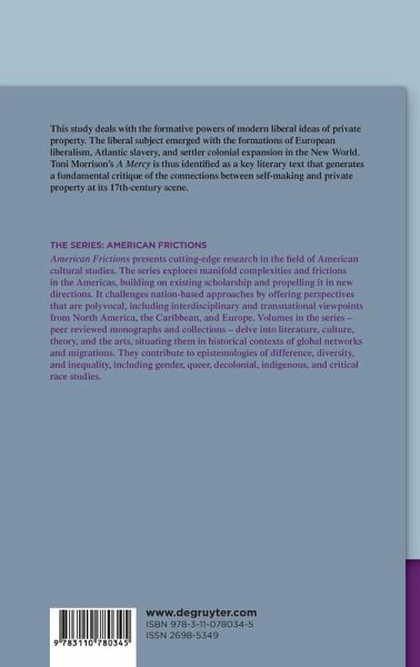 This study deals with the formative powers of modern liberal ideas of private property. The liberal subject emerged with the formations of European liberalism, Atlantic slavery, and settler colonial expansion in the New World. Toni Morrison's A Mercy is thus identified as a key literary text that generates a fundamental critique of the connections between self-making and private property at its 17th-century scene.