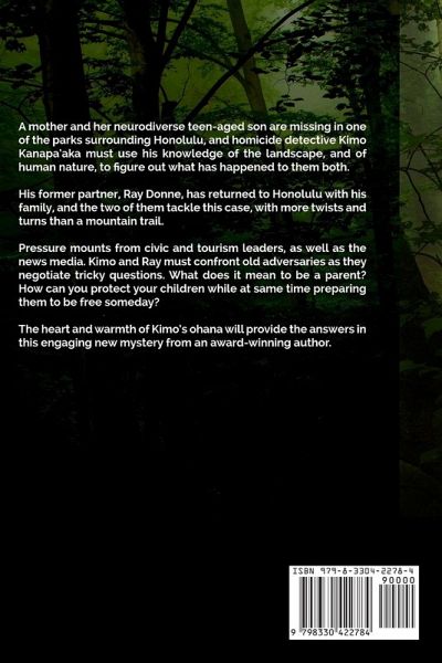 A Missing Mother and Son A mother and her neurodiverse teen-aged son are missing in one of the parks surrounding Honolulu, and homicide detective Kimo Kanapa'aka must use his knowledge of the landscape, and of human nature, to tackle this case, with more twists and turns than a mountain trail. Pressure mounts from civic and tourism leaders, as well as the news media. Kimo must confront old adversaries as he negotiates tricky questions. What does it mean to be a parent? How can you protect your children while at same time preparing them to be free someday? The heart and warmth of Kimo's ohana will provide the answers in this thrilling new mystery from an award-winning author.