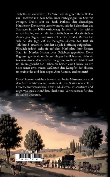 Trebellia ist verzweifelt: Der Vater will sie gegen ihren Willen zur Hochzeit mit dem Sohn eines Parteigängers im Stadtrat zwingen. Dabei liebt sie doch Pytheos, den ehemaligen Hauslehrer. Der aber ist verschwunden, seit das Sklavenheer des Spartacus in der Nähe vorüberzog. In dem Jahr, das seither verstrichen ist, wurden die Aufständischen von der römischen Armee geschlagen, und ausgerechnet ihr Bruder Marcus hat sich bei der Jagd auf die besiegten Sklaven den Ruf als "Bluthund" erworben. Nun hat sie jede Hoffnung aufgegeben. Plötzlich jedoch steht sie auf dem Marktplatz ihrer kleinen Stadt im Norden Italiens dem Geliebten gegenüber. Diese Begegnung reißt sie aus ihrem ruhigen Landleben und zieht sie in einen Strudel dramatischer Ereignisse, an die sie nicht einmal im Traum gedacht hat. Haben die beiden eine Chance, an der Seite seiner zwei treuen Gefährten den Kämpfen der Sklaven untereinander und dem langen Arm Roms zu entkommen?Dives' Roman verzichtet bewusst auf breite Massenszenen und den Auftritt historischer Persönlichkeiten. Stattdessen stellt er Durchschnittsmenschen - Freie und Sklaven - ins Zentrum und zeigt, was soziale Konflikte, Flucht und Vertriebensein für den Einzelnen bedeuten.