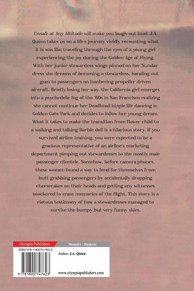 Unsafe at Any Altitude will make you laugh out loud. J.A. Quinn takes us on a life's journey vividly recounting what it is was like traveling through the eyes of a young girl experiencing the joy during the Golden Age of Flying. With her junior stewardess wings pinned on her Sunday dress she dreams of becoming a stewardess, handing out gum to passengers on lumbering propeller driven aircraft. Briefly losing her way, the California girl emerges into a psychedelic fog of the '60s in San Francisco realizing she cannot continue her Deadhead hippie life dancing in Golden Gate Park and decides to follow her young dream. What it takes to make the transition from flower child to a walking and talking Barbie doll is a hilarious story. If you survived airline training, you were expected to be a gracious representative of an airline's marketing department pimping out stewardesses to the mostly male passenger clientele. Somehow, before camera phones, these women found a way to fend for themselves from butt grabbing passengers by accidentally dropping cheesecakes on their heads and getting any witnesses snockered to erase memories of the flight. This story is a riotous testimony of how a stewardesses managed to survive the bumpy but very funny skies.