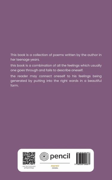This book is a collection of poems written by the author in her teenage years. this book is a combination of all the feelings which usually one goes through and fails to describe oneself. the reader may connect oneself to his feelings being generated by putting into the right words in a beautiful form. thanking you,