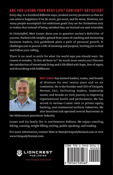 Are you living your best life? Content? Satisfied? Every day, in a hundred different ways, modern society promises us that we can achieve happiness if we do more, get more, and be more. However, too many people accomplish the ambitious goals they set for themselves only to realize that instead of being satisfied they are burned out and miserable. In UnSatisfied, Matt Lesser dares you to question society's definition of success. Packed with insights gained from years of coaching and mentoring business leaders, this guidebook plots a path of personal growth. It challenges you to pursue a life of meaning and purpose, inviting you to find and follow your calling. There is no need to settle for what the world says you should want. No reason to wonder, "Is this all there is?" So much more awaits you! Discover the satisfaction of intentional living and a life filled with hope, free of regret, and flourishing with fulfillment.