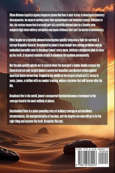When Defense Logistics Agency inspector James Martinez is sent to Iraq to investigate inventory discrepancies, he expects nothing more than spreadsheets and inventory counts. Unknown to him, his routine inspection is actually part of a carefully devised plan by a Senator who suspects high-level military corruption and needs evidence that can't be buried in bureaucracy. What begins as a carefully planned investigation quickly turns into a fight for survival. A corrupt Brigadier General, threatened by James's keen insight into solving problems and an embedded journalist sent to document James' every move, initiates a desperate plan to cover up the truth. A targeted roadside attack to eliminate the problem permanently. But the plan quickly spirals out of control when the insurgent's leader double crosses the General and not only targets James's convoy but launches coordinated strikes against American bases across Iraq. Trapped in the middle of the largest attack on U.S. forces in years, James, a civilian with no combat training, makes a decision that will forever alter his life. Broadcast live to the world, James's unexpected heroism becomes a testament to the courage found in the most unlikely of places. Unscheduled Valor is a pulse-pounding story of ordinary courage in extraordinary circumstances, the unexpected price of heroism, and the lengths one man will go to do the right thing and uncover the truth. No matter the cost.
