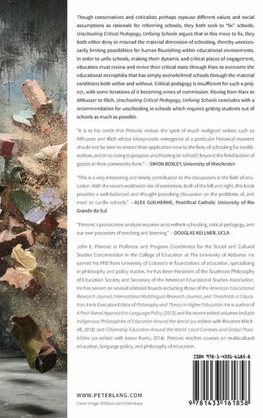 Though conservatives and criticalists perhaps espouse different values and social assumptions as rationale for reforming schools, they both seek to "fix" schools. Unschooling Critical Pedagogy, Unfixing Schools argues that in this move to fix, they both either deny or misread the material dimension of schooling, thereby unnecessarily limiting possibilities for human flourishing within educational environments. In order to unfix schools, making them dynamic and critical places of engagement, educators must review and revive their critical roots through Marx to overcome the educational necrophilia that has simply overwhelmed schools through the material conditions both within and without. Critical pedagogy is insufficient for such a project, with some iterations of it becoming errors of commission. Moving from Marx to Althusser to Illich, Unschooling Critical Pedagogy, Unfixing Schools concludes with a recommendation for unschooling in schools which requires getting students out ofschools as much as possible.