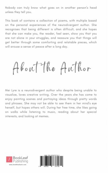 ""Nobody can truly know what goes on in another person's head unless they tell you. This book of contains a collection of poems, with multiple based on the personal experiences of the neurodivergent author. She recognises that being different is often difficult, and she hopes that she can make you, the reader, feel seen, show you that you are not alone in your struggles, and reassure you that things will get better through some comforting and relatable pieces, which will arouse a sense of peace after a long day.""