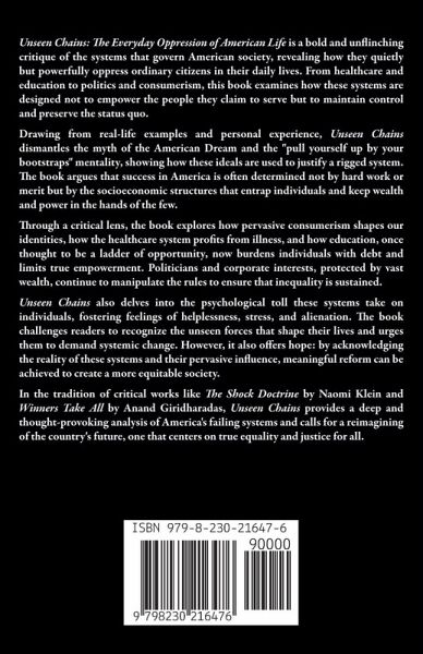 Unseen Chains: The Everyday Oppression of American Life is a bold and unflinching critique of the systems that govern American society, revealing how they quietly but powerfully oppress ordinary citizens in their daily lives. From healthcare and education to politics and consumerism, this book examines how these systems are designed not to empower the people they claim to serve but to maintain control and preserve the status quo. Drawing from real-life examples and personal experience, Unseen Chains dismantles the myth of the American Dream and the "pull yourself up by your bootstraps" mentality, showing how these ideals are used to justify a rigged system. The book argues that success in America is often determined not by hard work or merit but by the socioeconomic structures that entrap individuals and keep wealth and power in the hands of the few. Through a critical lens, the book explores how pervasive consumerism shapes our identities, how the healthcare system profits from illness, and how education, once thought to be a ladder of opportunity, now burdens individuals with debt and limits true empowerment. Politicians and corporate interests, protected by vast wealth, continue to manipulate the rules to ensure that inequality is sustained. Unseen Chains also delves into the psychological toll these systems take on individuals, fostering feelings of helplessness, stress, and alienation. The book challenges readers to recognize the unseen forces that shape their lives and urges them to demand systemic change. However, it also offers hope: by acknowledging the reality of these systems and their pervasive influence, meaningful reform can be achieved to create a more equitable society. In the tradition of critical works like The Shock Doctrine by Naomi Klein and Winners Take All by Anand Giridharadas, Unseen Chains provides a deep and thought-provoking analysis of America's failing systems and calls for a reimagining of the country's future, one that centers on true equality and justice for all.