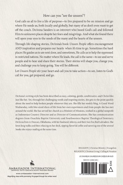 How can you "see the unseen"? God calls us all to live a life of purpose-to live prepared to be on mission and go where He needs us, both locally and globally, but many of us don't even want to get off the couch. DeAnna Sanders is an introvert who heard God's call and followed Him to unknown places despite her fears and misgivings. And what she found there will open your eyes to the needs of the many and the hearts of the unseen. Through life-shaping stories, DeAnna's book Unseen People offers encouragement AND inspiration and prepares our hearts when it's time to go. Sometimes the hard places He guides us to are next door, and sometimes, He calls us to help the oppressed in restricted nations. No matter where He leads, the call is the same-to see and serve people and to hear and share their stories. Their stories will shape you, change you, and challenge you to keep going. You will be different. Let Unseen People stir your heart and call you to take action-to see, listen to God's call for you, get prepared, and go. "In the fascinating pages of Unseen People, you will get to journey with a true global ambassador of hope...She doesn't serve up a wistful kind of hope. Rather, she offers the kind that creates change in people across the street and around the world." Michele Rickett Founder and CEO She Is Safe "DeAnna has long used the written word to share her heart for the lost and the mission believers have to share the love of God. Unseen People brings this vital message together to help open more eyes to the hope of Christ." Reagan Jackson Managing Editor for Adult Resources National Woman's Missionary Union, Birmingham, AL "Unseen People will challenge you to see the world with God's eyes and join in His great work where you are." Dr. Bryan Pain Senior Pastor First Baptist Duncan "Through Unseen People, DeAnna reflects on life lessons from ministering abroad to sipping coffee in the quietness of her own home. She informs us through her experiences, inspires us through her words, and challenges us through her direct questions to the reader. I encourage you to read, reflect, and respond whether you choose to read this book in a week or an essay at time for your daily devotion. You will be blessed by her words." Deborah Root, Ed.D. Professor and Chair of Communications Ouachita Baptist University "DeAnna invites us to her back porch and around the world, challenging us to see, hear, and really notice God at work in all He has created." Danette High Emeritus Missionary International Mission Board "Reflective, spiritual, personal, absorbing, and always authentic, DeAnna Sander's Unseen People challenges us all to live boldly and to push through whatever fears keep us from seeing the humanity and uniqueness of the people around us. While DeAnna has traveled the world in her missionary work, we can all lead lives of blessed purpose, whether in Kathmandu or in our own neighborhoods." Susan Madon, CFRE, CEO Minerva Nonprofit Management Consulting "DeAnna takes us on a journey around the world and opens our eyes to see the unseen-people and places. As she shares her life story, she even challenges us to ask ourselves who we are, and how we would like to be seen and known. DeAnna's heartwarming stories remind us that God is everywhere, and He is always working. And she provokes us to see the unseen people in our own lives through God's eyes." Arlene Johnson VP of Donor Development Trinity Broadcast Network