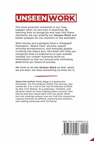Have you ever given up after first failing at something? Do you ever feel like you're just jumping from one opportunity to another without rhyme or reason? Is there really such a thing as an 'overnight' success? In his groundbreaking debut book, Unseen Work, Myles Biggs challenges his readers to acknowledge all of the unseen work in their lives: perceived past failures, seemingly disconnected life events and childhood circumstances. Biggs argues that no experience is ever wasted, but instead, our unseen moments build to determine our levels of success. Through top-notch storytelling, Biggs relays the fascinating experiences of the people he's interviewed for his podcast, Relish the Journey. He also guides his readers through thought-provoking questions and prompts that take an honest look at their own unseen work. Whether you are an entrepreneur growing your business in the trenches, an established executive in search of new ideas, or just a personal growth junkie always in search of more, Unseen Work contains mindset altering ideas for you to chew on.