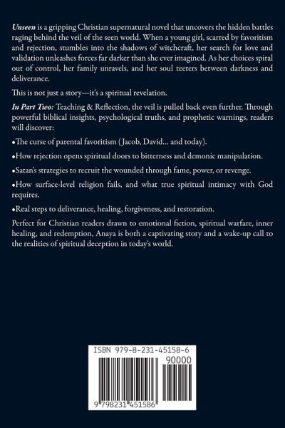 Unseen is a gripping Christian supernatural novel that uncovers the hidden battles raging behind the veil of the seen world. When a young girl, scarred by favoritism and rejection, stumbles into the shadows of witchcraft, her search for love and validation unleashes forces far darker than she ever imagined. As her choices spiral out of control, her family unravels, and her soul teeters between darkness and deliverance. This is not just a story-it's a spiritual revelation. In Part Two: Teaching & Reflection, the veil is pulled back even further. Through powerful biblical insights, psychological truths, and prophetic warnings, readers will discover: -The curse of parental favoritism (Jacob, David... and today). -How rejection opens spiritual doors to bitterness and demonic manipulation. -Satan's strategies to recruit the wounded through fame, power, or revenge. -How surface-level religion fails, and what true spiritual intimacy with God requires. -Real steps to deliverance, healing, forgiveness, and restoration. Perfect for Christian readers drawn to emotional fiction, spiritual warfare, inner healing, and redemption, Anaya is both a captivating story and a wake-up call to the realities of spiritual deception in today's world.
