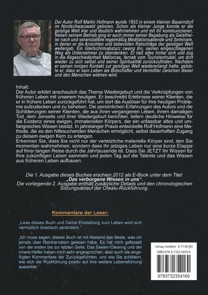 Der Autor erklärt anschaulich das Thema Wiedergeburt und die Verknüpfung von früheren Leben mit unserem heutigen. Er beschreibt Erlebnisse seiner Klienten, die er in frühere Leben zurückgeführt hat, um dort die Auslöser für ihre heutigen Probleme aufzudecken und zu beheben. Die persönlichen Erfahrungen des Autors und die Schilderungen seiner Klienten, die aus ihren vergangenen Leben, ihrem damaligen Tod, dem Jenseits und ihrer Wiedergeburt berichten, liefern deutliche Hinweise für die Existenz eines ewigen, immateriellen Körpers, der ein unfassbar altes und umfangreiches Wissen besitzt. In jahrelanger Praxis entwickelte Rolf Hofmann eine Methode, die es den hilfesuchenden Menschen ermöglicht, selbst dauerhaften Zugang zu diesem ewigen Kern zu erlangen. Erkennen Sie, dass Sie nicht nur der verletzliche materielle Körper sind, den Sie momentan wahrnehmen, sondern dass Ihr jetziges Leben nur eine kurze Etappe auf Ihrer langen Reise durch die Jahrtausende ist. Dass Sie JETZT Ihr Wissen für zukünftige Leben sammeln, und jeden Tag auf die Talente und das Wissen aus früheren Leben aufbauen.Die erste Ausgabe dieses Buches erschien 2012 als E-Book unter dem Titel: "Das verborgene Wissen in uns". Die vorliegende 2. Ausgabe enthält zusätzliche Details und den chronologischen Sitzungsablauf der Ofaatu-Rückführung.
