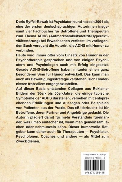 Dr. Doris Ryffel-Rawak ist Psychiaterin und hat seit 2001 als eine der ersten deutschsprachigen Autorinnen insgesamt vier Fachbücher für Betroffene und Therapeuten zum Thema ADHS (Aufmerksamkeitsdefizit/Hyperaktivitätsstörung) bei Erwachsenen verfasst. Im vorliegenden Buch versucht die Autorin, die ADHS mit Humor zu verbinden. Heute wird immer öfter vom Einsatz von Humor in der Psychotherapie gesprochen und von einigen Psychiatern und Psychologen auch mit Erfolg eingesetzt. Gerade ADHS-Betroffene haben mitunter einen ganz besonderen Sinn für Humor entwickelt. Das kann man auch als Bewältigungsstrategie verstehen, sich Hindernissen trotz allem entgegenzustellen. Auf dieser Basis entstanden Collagen aus Reklame-Bildern der 30er- bis 50er-Jahre, die einige typische Symptome der ADHS darstellen, versehen mit entsprechenden Erklärungen und Aussagen oder Beispielen von Patienten aus der Praxis. Das »Bilderbuch« ist für Betroffene, deren Partner und Angehörige gedacht. Die Autorin plädiert damit für mehr Verständnis füreinander, was umso einfacher ist, wenn man gemeinsam lachen oder schmunzeln kann. Dieser humorvolle Ratgeber kann daher auch für Therapeuten - Psychiater, Psychologen, Coaches und andere - als Mittel zum Zweck dienen.