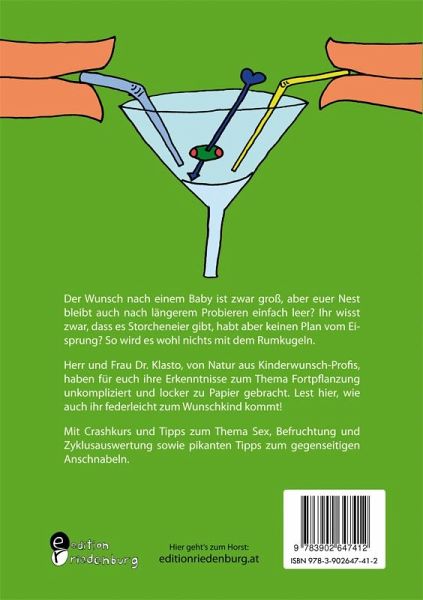Der Wunsch nach einem Baby ist zwar groß, aber euer Nest bleibt auch nach längerem Probieren einfach leer? Ihr wisst zwar, dass es Storcheneier gibt, habt aber keinen Plan vom Eisprung? So wird es wohl nichts mit dem Rumkugeln.Herr und Frau Dr. Klasto, von Natur aus Kinderwunsch-Profis, haben für euch ihre Erkenntnisse zum Thema Fortpflanzung unkompliziert und locker zu Papier gebracht. Lest hier, wie auch ihr federleicht zum Wunschkind kommt!Mit Crashkurs und Tipps zum Thema Sex, Befruchtung und Zyklusauswertung sowie pikanten Tipps zum gegenseitigen Anschnabeln.