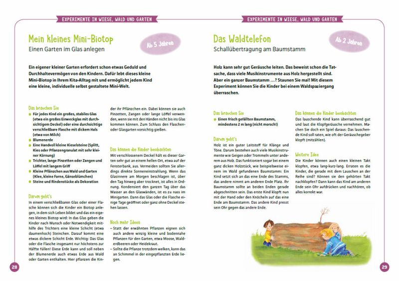 - Die Ideen stehen unter den Mottos: "Die Kita-Küche als Forscherlabor", "Experimente in Wiese, Wald und Garten", "Versuche rund um Sonne, Licht und Schatten", "Die Elemente Forscherwerkstatt", "Experimente und Erfahrungen mit dem eigenen Körper".