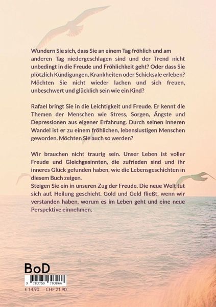 Wundern Sie sich, dass Sie an einem Tag fröhlich und am anderen Tag niedergeschlagen sind und der Trend nicht unbedingt in die Freude und Fröhlichkeit geht? Oder dass Sie plötzlich Kündigungen, Krankheiten oder Schicksale erleben?Möchten Sie nicht wieder lachen und sich freuen, unbeschwert und glücklich sein wie ein Kind? Rafael bringt Sie in die Leichtigkeit und Freude. Er kennt die Themen der Menschen wie Stress, Sorgen, Ängste und Depressionen aus eigener Erfahrung. Durch seinen inneren Wandel ist er zu einem fröhlichen, lebenslustigen Menschen geworden. Möchten Sie auch so werden?Wir brauchen nicht traurig sein. Unser Leben ist voller Freude und Gleichgesinnten, die zufrieden sind und ihr inneres Glück gefunden haben, wie die Lebensgeschichten in diesem Buch zeigen.Steigen Sie ein in unseren Zug der Freude. Die neue Welt tut sich auf. Heilung geschieht. Gold und Geld fließt, wenn wir verstanden haben, worum es im Leben geht und eine neue Perspektive einnehmen.