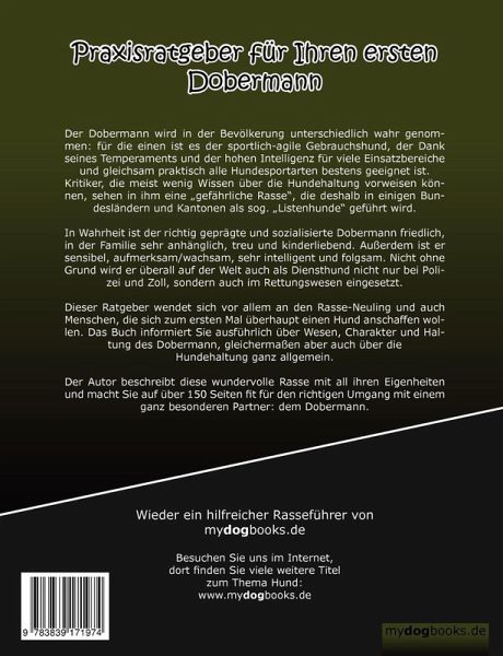 Der Dobermann wird in der Bevölkerung unterschiedlich wahr genommen: für die einen ist es der sportlich-agile Gebrauchshund, der Dank seines Temperaments und der hohen Intelligenz für viele Einsatzbereiche und gleichsam praktisch alle Hundesportarten bestens geeignet ist.Kritiker, die meist wenig Wissen über die Hundehaltung vorweisen können, sehen in ihm eine "gefährliche Rasse", die deshalb in einigen Bundesländern und Kantonen als sog. "Listenhunde" geführt wird.In Wahrheit ist der richtig geprägte und sozialisierte Dobermann friedlich, in der Familie sehr anhänglich, treu und kinderliebend. Außerdem ist er sensibel, aufmerksam/wachsam, sehr intelligent und folgsam. Nicht ohne Grund wird er überall auf der Welt auch als Diensthund nicht nur bei Polizei und Zoll, sondern auch im Rettungswesen eingesetzt. Dieser Ratgeber wendet sich vor allem an den Rasse-Neuling und auch Menschen, die sich zum ersten Mal überhaupt einen Hund anschaffen wollen. Das Buch informiert Sie ausführlich über Wesen, Charakter und Haltung des Dobermann, gleichermaßen aber auch über die Hundehaltung ganz allgemein.Der Autor beschreibt diese wundervolle Rasse mit all ihren Eigenheiten und macht Sie auf über 150 Seiten fit für den richtigen Umgang mit einem ganz besonderen Partner: dem Dobermann.
