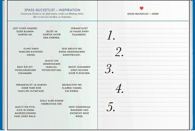 Mit Ideen für gemeinsame Unternehmungen, spannende Gespräche und Platz für Träume und Pläne für Familien mit Kindern im und darüber hinausEin Erinnerungsschatz mit Platz für Einträge und Fotos, damit die Erlebnisse nicht vergessen werden"We-Time" statt "Me-Time" - Gemeinsame Erlebnisse, die glücklich machen!Für mehr Achtsamkeit gegenüber den Menschen und Beziehungen, die uns am wichtigsten sind
