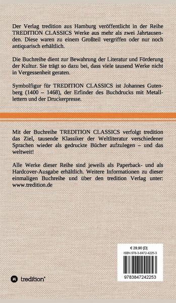 Diese Hardcover-Ausgabe ist Teil der TREDITION CLASSICS. Der Verlag tredition aus Hamburg veröffentlicht in der Buchreihe TREDITION CLASSICS Werke aus mehr als zwei Jahrtausenden. Diese waren zu einem Großteil vergriffen oder nur noch antiquarisch erhältlich. Mit TREDITION CLASSICS verfolgt tredition das Ziel, tausende Klassiker der Weltliteratur verschiedener Sprachen wieder als gedruckte Bücher zu verlegen und das weltweit! Die Buchreihe dient zur Bewahrung der Literatur und Förderung der Kultur. Sie trägt so dazu bei, dass viele tausend Werke nicht in Vergessenheit geraten.