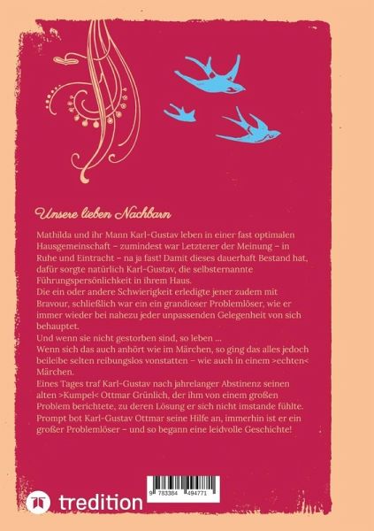 In diesem Buch wird humorvoll sowie satirisch das Zusammenleben eines Paares, Karl-Gustav und Mathilda, sowie jenes mit deren Nachbarn beschrieben. Spezifisch werden einige Kernpunkte herausgestellt, wobei sich insbesondere ein Umzug herauskristallisiert, bei dem aber auch so gar nichts gelingen will!