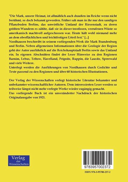 Nordhausen beschreibt in seinem vorliegenden Werk die Mark Brandenburg und Berlin. Neben allgemeinen Informationen über die Geologie der Region geht der Autor ausführlich auf die Reichshauptstadt Berlin sowie das Umland ein. In eigenen Abschnitten findet der Leser Hinweise zu den Regionen Barnim, Lebus, Teltow, Havelland, Prignitz, Ruppin, die Lausitz, Spreewald und viele Weitere.