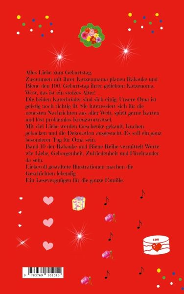 Alles Liebe zum Geburtstag. Zusammen mit ihrer Katzenmama planen Rabauke und Biene den 100. Geburtstag ihrer geliebten Katzenoma. Wow, das ist ein stolzes Alter! Die beiden Katerbrüder sind sich einig: Unsere Oma ist geistig noch richtig fit. Sie interessiert sich für die neuesten Nachrichten aus aller Welt, spielt gerne Karten und löst problemlos Kreuzworträtsel. Mit viel Liebe werden Geschenke gekauft, Kuchen gebacken und die Dekoration ausgesucht. Es soll ein ganz besonderer Tag für Oma sein. Band 10 der Rabauke und Biene Reihe vermittelt Werte wie Liebe, Geborgenheit, Zufriedenheit und Füreinander da sein. Liebevoll gestaltete Illustrationen machen die Geschichten lebendig. Ein Lesevergnügen für die ganze Familie.