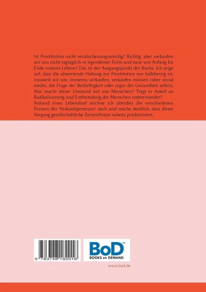 Ist Prostitution nicht verabscheuungswürdig? Richtig, aber verkaufen wir uns nicht tagtäglich in irgendeiner Form und zwar von Anfang bis Ende unseres Lebens? Das ist der Ausgangspunkt des Buchs. Ich zeige auf, dass die abwertende Haltung zur Prostitution nur halbherzig ist, insoweit wir uns immerzu verkaufen, verkaufen müssen (über social media, der Frage nach der Bedürftigkeit oder sogar der Gesundheit selbst). Was macht dieser Umstand mit uns Menschen? Trägt er Anteil an Radikalisierung und Entfremdung der Menschen untereinander? Anhand eines Lebenslauf zeichne ich überdies die verschiedenen Formen des 'Verkaufsprozesses' nach und mache deutlich, dass dieser Vorgang gesellschaftliche Zerwürfnisse nahezu prädestiniert.Es geht mir, und dass möchte ich ganz besonders stark betonen, NICHT um eine Schönfärberei der Prostitution! Jedoch um eine gesellschaftliche Weitung des Blicks auf einen Prozess neuartiger Knechtschaft, dessen wir uns aus guten Gründen widersetzen sollten.