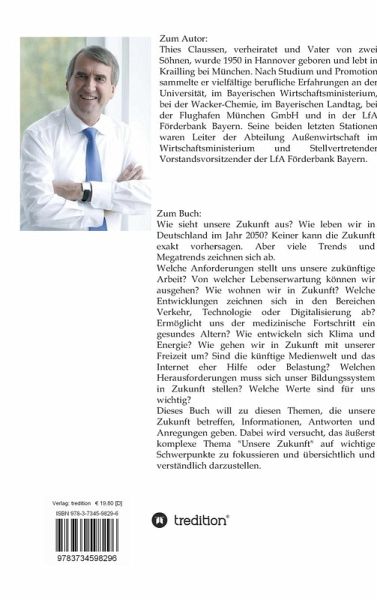 Dr. Thies Claussen hat neben zahlreichen Artikeln mehrere Bücher veröffentlicht: "In unruhigen Zeiten. Lebensfragen und Denkanstöße" (2025), "Ludwig Erhard. Sein Leben für die Soziale Marktwirtschaft - Biografie und Ausblick" (2024), "Unser Leben. Auf der Suche nach einem Kompass" (2023), "Im Wandel der Zeit. Wo stehen wir? Wohin gehen wir?" (2022), "Denkanstöße - Acht Fragen unserer Zeit" (2021), "Unsere Zukunft nach Corona" (2020), "Zukunft beginnt heute" (2018) und "Unsere Zukunft" (2017). Der Autor war Stv. Vorstandsvorsitzender der LfA Förderbank Bayern und davor Ministerialdirigent im Bayerischen Wirtschaftsministerium. Viele Jahre war er auch enger Mitarbeiter von Alois Glück im Bayerischen Landtag. Berufliche Erfahrungen sammelte er auch als Hochschulassistent und Lehrbeauftragter, im Management der Wacker-Chemie AG, als Prokurist der Flughafen München GmbH, oder als Aufsichtsratsmitglied der Messe München, als Aufsichtsratsvorsitzender des Automobiltechnikums Bayern und in weiteren Funktionen. Claussens Bücher sind sehr empfehlenswert für alle, die sich für grundlegende Fragen unseres Lebens, unserer Wirtschaft, unserer Gesellschaft und unserer Zukunft interessieren. Der Autor schreibt präzise, klar und gut verständlich. Süddeutsche Zeitung, Berliner Zeitung, Münchner Merkur, Passauer Neue Presse, und weitere haben über die Bücher von Claussen berichtet.