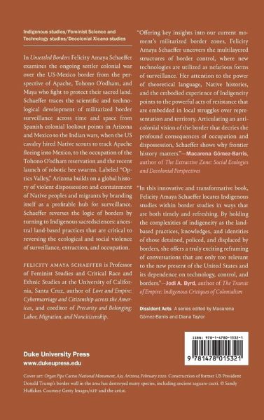 In Unsettled Borders Felicity Amaya Schaeffer examines the ongoing settler colonial war over the US-Mexico border from the perspective of Apache, Tohono O'odham, and Maya who fight to protect their sacred land. Schaeffer traces the scientific and technological development of militarized border surveillance across time and space from Spanish colonial lookout points in Arizona and Mexico to the Indian wars, when the US cavalry hired Native scouts to track Apache fleeing into Mexico, to the occupation of the Tohono O'odham reservation and the recent launch of robotic bee swarms. Labeled "Optics Valley," Arizona builds on a global history of violent dispossession and containment of Native peoples and migrants by branding itself as a profitable hub for surveillance. Schaeffer reverses the logic of borders by turning to Indigenous sacredsciences: ancestral land-based practices that are critical to reversing the ecological and social violence of surveillance, extraction, and occupation.