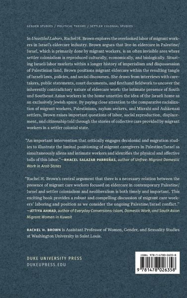 In Unsettled Labors, Rachel H. Brown explores the overlooked labor of migrant workers in Israel's eldercare industry. Brown argues that live-in eldercare in Palestine/Israel, which is primarily done by migrant workers, is an often invisible area where settler colonialism is reproduced culturally, economically, and biologically. Situating Israeli labor markets within a longer history of imperialism and dispossession of Palestinian land, Brown positions migrant eldercare within the resulting tangle of Israeli laws, policies, and social discourses. She draws from interviews with caretakers, public statements, court documents, and first-hand fieldwork to uncover the inherently contradictory nature of elder care work: the intimate presence of South and Southeast Asian workers in the home unsettles the idea of the Israeli home as an exclusively Jewish space. By paying close attention to the comparative racialization of migrant workers, Palestinians, asylum seekers, and Mizrahi and Ashkenazi settlers, Brown raises important questions of labor, social reproduction, displacement, and citizenship told through the stories of collective care provided by migrant workers in a settler colonial state.