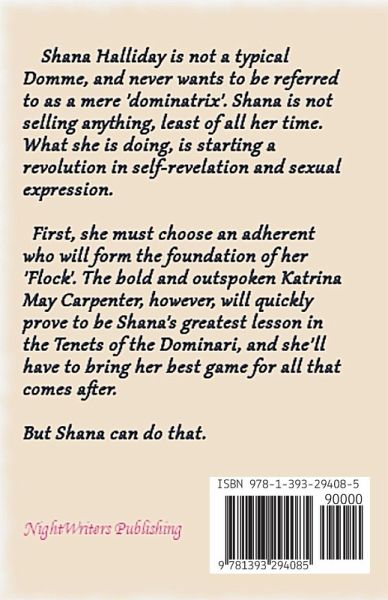 Shana Halliday is not a typical Domme, and never wants to be referred to as a mere 'dominatrix'. Shana is not selling anything, least of all her time. What she is doing, is starting a revolution in self-revelation and sexual expression. First, she must choose an adherent who will form the foundation of her 'Flock'. The bold and outspoken Katrina May Carpenter, however, will quickly prove to be Shana's greatest lesson in the Tenets of the Dominari, and she'll have to bring her best game for all that comes after. But Shana can do that.