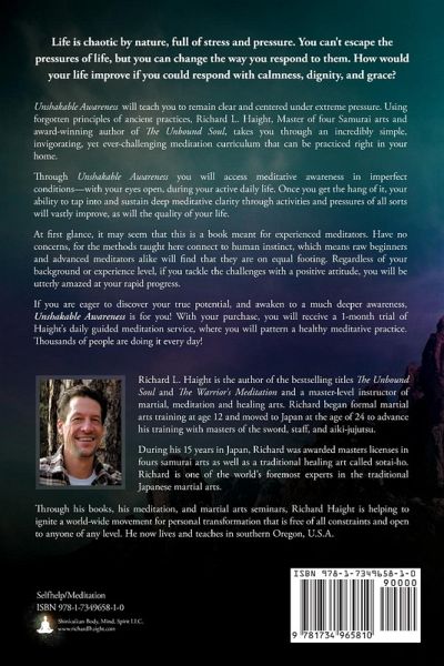 Unshakable Awareness addresses a critical need for unsettled times; how to stay present, clear-minded and calm when facing unpredictable life events. It offers a recipe for grounded presence when life is challenging. Using forgotten principles of ancient practices, Richard L. Haight, Master of four Samurai arts and award-winning author of The Unbound Soul and the best-selling title The Warrior's Meditation, takes you through an incredibly simple, invigorating, yet ever-challenging meditation curriculum that can be practiced right in your home. Through Unshakable Awareness you will access meditative awareness in imperfect conditions-with your eyes open, during your active daily life. Once you get the hang of it, your ability to tap into and sustain deep meditative clarity through activities and pressures of all sorts will vastly improve, as will the quality of your life. At first glance, it may seem that this is a book meant for experienced meditators. Have no concerns, for the methods taught here connect to human instinct, which means raw beginners and advanced meditators alike will find that they are on equal footing. Regardless of your background or experience level, if you tackle the challenges with a positive attitude, you will be utterly amazed at your rapid progress. Throughout your training, you will make use of a powerful progress assessment system born of ancient lost wisdom. You will get clear, daily feedback on your improvement, which will inspire you to take on even greater challenges and realize yet further awareness possibilities and health benefits. Included in this eBook are a downloadable step-by-step workbook and training schedule to help keep you on track. According to modern science, here are the health benefits that you will likely gain from the exercises found in Unshakable Awareness: * Improved circulatory and cellular health, resulting in greater physical and mental endurance * Improved immune function, resulting in decreased cellular inflammation and pain * Increased positive emotion through reduction of anxiety, depression, and stress * Improved ability to introspect by providing a more holistic, grounded life perspective * Improved social life from a boost in emotional intelligence and compassion with a reduction in feelings of insecurity * Increased brain matter in areas related to paying attention, positive emotions, emotional regulation, and self-control * Reduction in emotional reactivity * Improved memory, creativity, and abstract thinking. If you are eager to discover your true potential and awaken to a much deeper awareness, Unshakable Awareness is for you! With your purchase, you will receive a 1-month trial of Haight's daily guided meditation service, where you will pattern a health